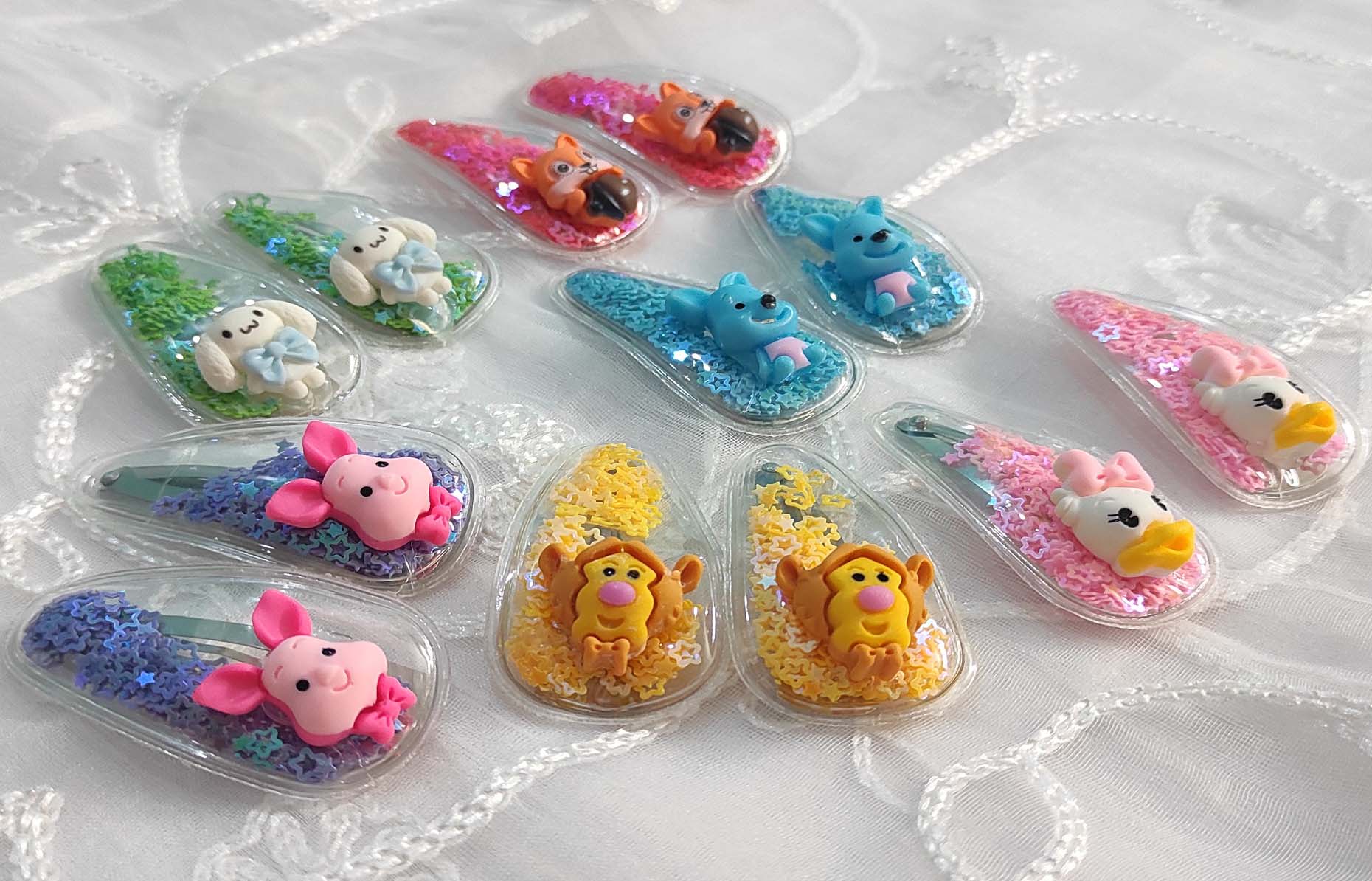 Transparent hairclip with Colored sequin and animal cartoon. Fancy clips for girls. Pack of 12.