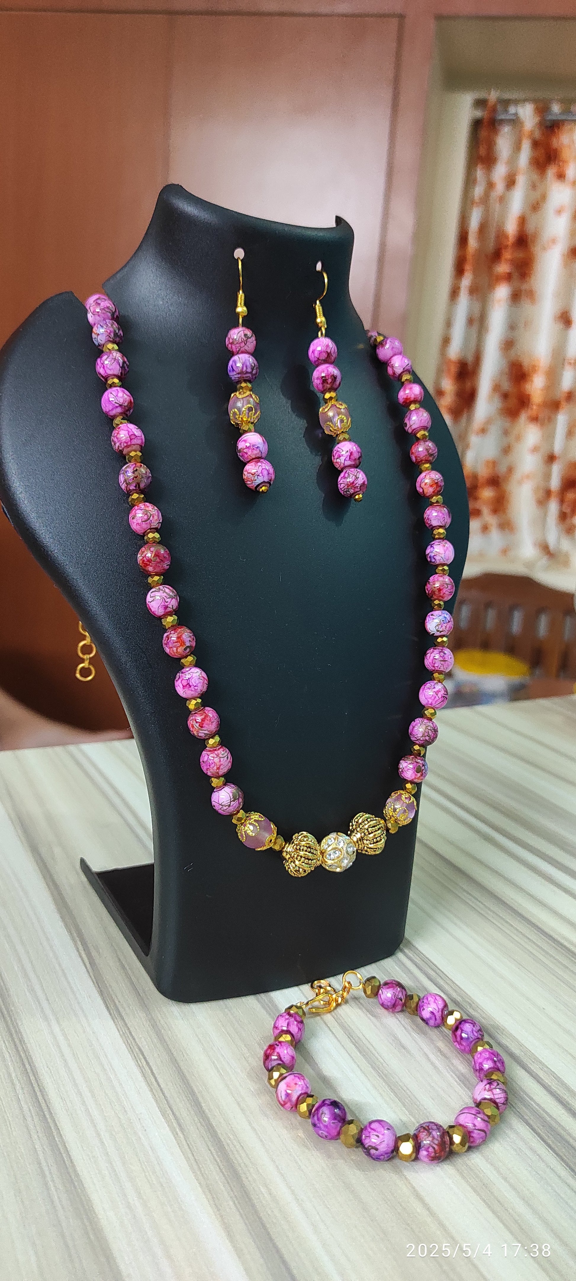 Single line Vibrant purple & gold beads handmade jewellery set with earring & bracelet for women & girls. Skillful artistry breathes life into every exquisite jewelry design.